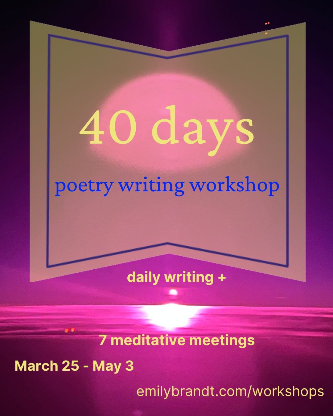 In this range of workshops, participants gather via Zoom, in good company, to support small and large writing projects. Whether a DocuPoetry project, 40 Days of creating a long poem or poem series, or a Solar Year for making substantial progress on a book, these workshops help you clarify your vision for a meaningful writing project. And, a range of generative practices and loose structures of accountability help you find and maintain flow to produce the work you desire. Make space for the project you've been putting aside for too long, or haven't yet allowed yourself to uncover!